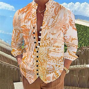 בגדי ריקוד גברים עץ קוקוס צמחים טרופיים חולצה חולצת הוואי חולצת אלוהה שרוול ארוך חולצה עומד אופנתי מעצב יום יומי בָּחוּץ חופשה רחוב צהוב פול כתום S M L