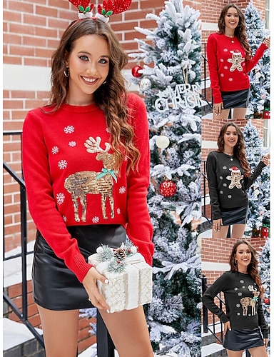 בגדי ריקוד נשים סוודר יום יומי רך אייל חג המולד מצולע צווארון עגול קצר פאייטים סרוג שרוול ארוך חולצות רגילות לִסְרוֹג בָּחוּץ יומי חגים שחור יין סתיו חורף