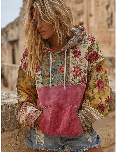 בגדי ריקוד נשים סווטשירט קפוצ'ון סוודר פרחוני גראפי יום יומי בוהו שרוול ארוך עם קפוצ'ון חולצות רגילות רחוב לבוש ליום טלאים דפוס כיס קדמי צהוב ורוד מסמיק סגול תלתן אביב סתיו חורף