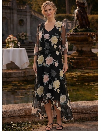 גזרת A באורך הקרסול השמלה המפלגה שמלת קוקטייל שמלת אורח לחתונה שמלה לאם הכלה שרוול 4\3 צווארון V סקופ צוואר אלגנטית רשמי אורחת חתונה שיפון נצנצים בד מתיחה עם פרח