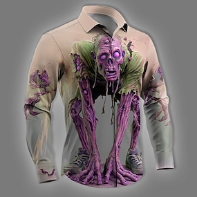 חג ליל כל הקדושים בגדי ריקוד גברים הדפסת 3D זומבים מחריד חולצה חולצה עם כפתורים שרוול ארוך סגנון גותי כהה חגים לבוש רחוב אביב סתיו צווארון מתקפל הדפסת תלת מימד חולצות צווארון ורוד מסמיק פול סגול תלתן