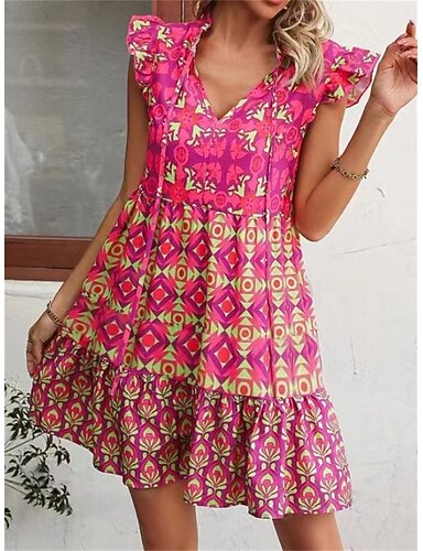 בגדי ריקוד נשים שמלת מיני שמלת קז'ואל שמלה אתנית שמלת בוהו שמלת צווארון הלטר אופנתי מסוגנן מודרני חופשה יומי פגישה (דייט) רגיל גיאומטרי דפוס ללא שרוולים צוואר הלטר ורוד מסמיק קיץ אביב