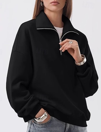 בגדי ריקוד נשים Pullover סווטשירטים זיפ אפ סווטשירטים אחיד אופנתי יום יומי שרוול ארוך צווארון גבוה חולצות רגילות רחוב לבוש ליום קזו'אל חצי רוכסן רוכסן רבע רוכסן שחור סתיו חורף