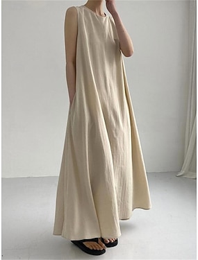 בגדי ריקוד נשים לבן כחול נייבי פול קיץ אביב שמלת מקסי שמלות פשתן מכותנה שמלת קז'ואל שמלת גופייה בסיסי מודרני יומי סוף שבוע מונח בצורה רפויה אחיד צווארון עגול קצר צווארון חולצה