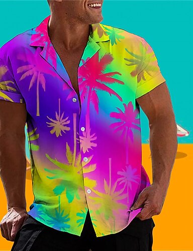 בגדי ריקוד גברים שיפוע עץ קוקוס צמחים טרופיים חולצה חולצת הוואי חולצת אלוהה שרוולים קצרים חולצה צווארון מתקפל טרופי אופנתי הוואי קזו'אל הוואי חגים שחור פול סגול S M L