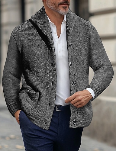 בגדי ריקוד גברים סוודר קרדיגן סוודר קצוץ סוודר סרוג מצולע לִסְרוֹג רגיל כפתור למעלה כיס אחיד צווארון צעיף (שאל) אופנתי קלסי לבוש יומיומי פגישה (דייט) ביגוד סתיו חורף שחור אפור בהיר M L XL