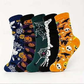 5 זוגות גולגולת ליל כל הקדושים & גרביים מזדמנים בהדפס דלעת מצויר - סתיו סופג זיעה & גרבי רצפת חורף לגברים ולנשים, סט גרביים קז'ואל