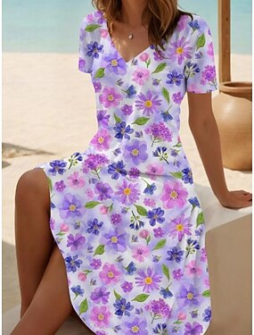 בגדי ריקוד נשים שמלת מידי שמלת קז'ואל שמלת סקייטר שמלת קיץ אופנתי מודרני יומי חוף סוף שבוע רגיל פרחוני שרוולים קצרים צווארון V שחור לבן פול סגול קיץ