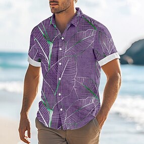 בגדי ריקוד גברים גיאומטרי עלה דקל צמחים טרופיים חולצה חולצת גואיברה חולצת הוואי שרוולים קצרים הוואי חופשה לבוש ליום ביגוד חוף קיץ אביב צווארון מתקפל כפתור למעלה חולצות צווארון ורוד מסמיק פול סגול תלתן
