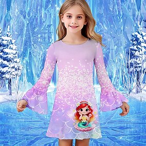 בנות ' תלת מימד אנימציה בתולת ים שמלה שמלת סוודר שרוול ארוך קיץ אביב חופשה יומי חגים נסיכות יפה מתוק ילדים 4-12 שנים שמלת קז'ואל שמלה עם כיווץ במותן עד הברך רגיל