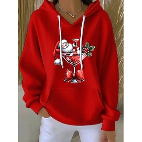 בגדי ריקוד נשים סווטשירט קפוצ'ון סוודר גראפי סנטה קלאוס חג מולד יום יומי שרוול ארוך עם קפוצ'ון חולצות רגילות בגדי ערב למסיבה רחוב לבוש ליום פול אודם כתום תלתן אדום ולבן אביב סתיו חורף