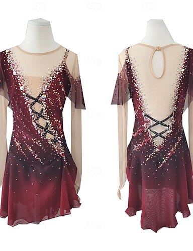 שמלה להחלקה אמנותית בגדי ריקוד נשים בנות החלקה על הקרח שמלות אדום טלאים פתוח בגב רשת ספנדקס סטרצ'י (נמתח) הדרכה אימון מקצועי ביגוד להחלקה על הקרח שמור על חום הגוף קריסטלים / אבנים נוצצות שרוול ארוך