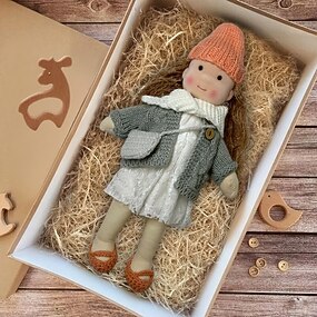 בובת וולדורף מכותנה, בובת אמנית, בובת תחפושות מיניאטורית, בעבודת יד, עשה זאת בעצמך, קופסת מתנה ליל כל הקדושים, אריזה, ברכה למתנות חג המולד