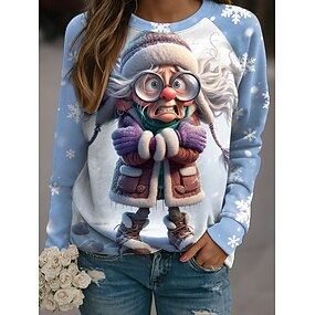 סוודר נשים חורף חופשה הדפס גמד עם שרוולים ארוכים צוואר עגול דפוס פתית שלג נעים קזוּאל אפור כחול במידות שונות