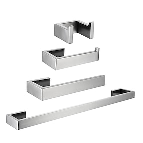 סט אביזרי אמבטיה כולל וו חלוק בעל נייר טואלט ומוט מגבת יחיד נירוסטה רכוב קיר כסוף 4 יחידות