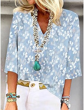 חולצה לנשים מכופתרת עם הדפס פרחוני של פרחים בעיצוב אלגנטי חולצה קצרה עם צוואר V עם כפתורים כחולה קיץ אביב