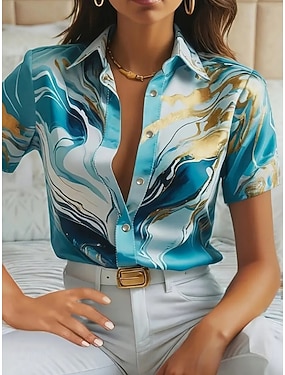 חולצת נשים עם שרוול ארוך Button Down בלוז גרפית גיאומטרית יומית קז'ואל חולצת שרוול קצר צווארון טופים רגילים יומיומית ורוד כחול ירוק קיץ אביב