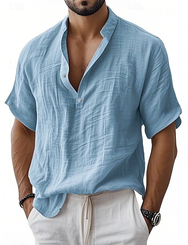 בגדי ריקוד גברים חולצה חולצת פשתן חולצת צווארון להקה חולצה פופ-אובר חולצת קיץ ביגוד חוף אחיד חופשה קזו'אל שחור לבן ורוד מסמיק כחול נייבי שרוולים קצרים הנלי קיץ ביגוד