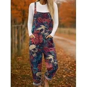 ליל כל הקדושים סרבלים 100% כותנה לנשים קל משקל פרחוני ללא שרוולים ללא שרוולים מותן רחב צווארון עגול כיס חופשה יומיומי גזרה רפויה שחור לבן אדום סתיו