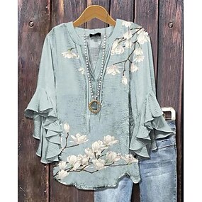 חולצת נשים עם צוואר V עם שרוול עם שכבות רפלים טופים גרפי פרחוני בוהמיה נוסטלגית יומית באורך 3/4 שרוול רגילים טופים יומיים לחופשה לבילוי הדפס ורוד אדום כחול תכלת כתום קיץ אביב סתיו
