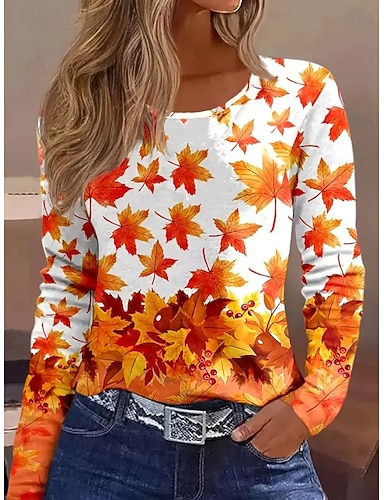 בגדי ריקוד נשים חולצה קצרה גראפי צמחים וינטאג' מסוגנן קלסי שרוול ארוך צווארון עגול קצר צווארון עגול חולצות רגילות יומי דפוס כתום תלתן לבן שמנת אביב סתיו חורף