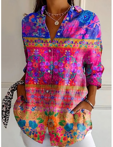 בגדי ריקוד נשים חולצה פרחוני רטרו\וינטאג' אתני שרוול ארוך צווארון חולצה חולצות רגילות יומי חגים כיס כפתורים דפוס שחור יין פוקסיה קיץ