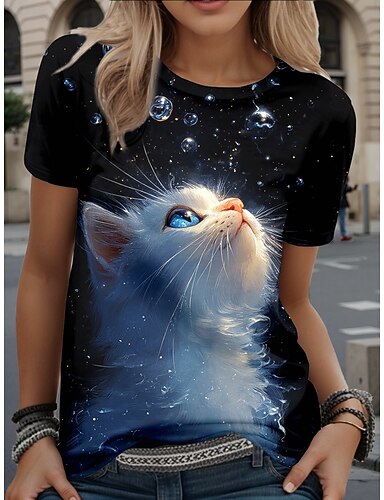 בגדי ריקוד נשים חולצה קצרה גראפי חיה חתול מסוגנן יום יומי שרוולים קצרים צווארון עגול חולצות רגילות יומי סוף שבוע דפוס שחור קיץ אביב