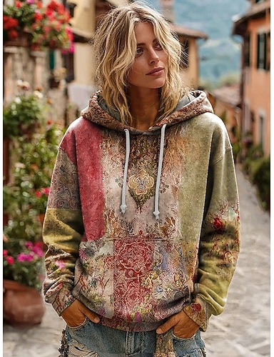 בגדי ריקוד נשים סווטשירט קפוצ'ון סוודר פרחוני גראפי אלגנטית חם פעיל שרוול ארוך עם קפוצ'ון חולצות רגילות רחוב לבוש ליום קזו'אל טלאים דפוס אודם סגול בהיר סגול חום תלתן אביב סתיו חורף