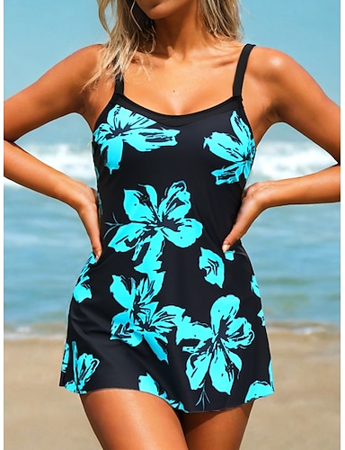 בגדי ריקוד נשים בגדי ים טנקיני 2 חתיכות שמלת בגד ים בגד ים 2חלקים בגדי ים צנועים חופשה בגדי חוף פרחוני דפוס כתפיה ללא שרוולים בגדי ים