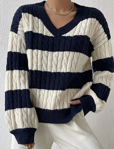 בגדי ריקוד נשים סוודר סגנון רחוב יום יומי פסים כבל צווארון V סרוג שרוול ארוך חולצות רגילות לִסְרוֹג יומי חגים ליציאה כחול ים סתיו חורף