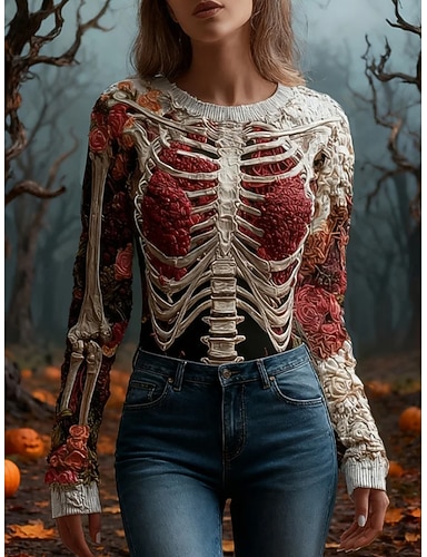 בגדי ריקוד נשים סוודר סגנון חמוד סגנון רחוב יום יומי גראפי שלד צווארון עגול קצר טלאים סרוג שרוול ארוך חולצות רגילות לִסְרוֹג ליל כל הקדושים אודם סתיו חורף