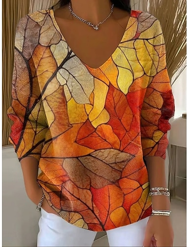 בגדי ריקוד נשים סוודר אופנתי סגנון רחוב יום יומי פרחוני גראפי צווארון V גדול סרוג שרוול ארוך חולצות רגילות לִסְרוֹג בָּחוּץ יומי כתום אביב סתיו