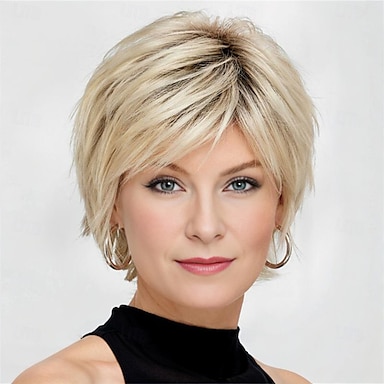 פאות בלונדיניות קצרות לנשים פאות בלונדיניות בגזרת פיקסי עם פוני ישר שכבות שיער קצר פאות פאות בלונדיניות בהיר במראה טבעי