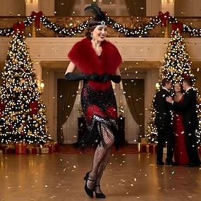 סט רטרו\וינטאג' שנות השבעים השואגות שנות ה-20 השמלה שמלת חג המולד צעיף פרווה מלאכותית עם אביזרים גאטסבי הגדול פלפר פאייטים פרנזים תחפושות בגדי ריקוד נשים חג המולד ראש השנה