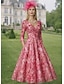גזרת A באורך הקרסול שמלות קוקטייל אלגנטית וינטאג' פרחוני חצי שרוול צווארון V חתונה רשמי שמלה ורודה סאטן תחרה עם ריקמה כיס