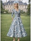 גזרת A באורך הקרסול שמלה פרחונית שמלות קוקטייל אלגנטית וינטאג' פרחוני שרוול ארוך צווארון V מסיבת חצר חתונה כיס סאטן ג'אקרד עם הדפס פרחוני פפיון(ים)
