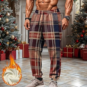 חג המולד בגדי ריקוד גברים משובץ מכנסי טרנינג פליסה שרוך מותן אלסטי וינטאג' יום יומי בָּחוּץ בית לבוש ליום כיס תרמי חורף הדפסת תלת מימד אדום כהה
