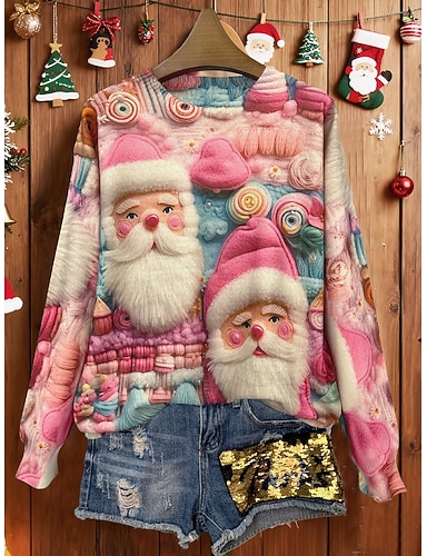 חג המולד סוודר לנשים סוודר יומי קז'ואל גרפי סנטה קלאוס צלעות צווארון עגול סרוג הדפס שרוולים ארוכים רגיל חולצות סריג חוץ סוף שבוע ורוד סתיו חורף