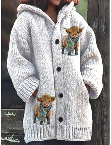 בגדי ריקוד נשים קרדיגן חופשה יומי גראפי חיה מצולע עם קפוצ'ון סרוג דפוס כיס קדמי שרוול ארוך חולצות רגילות לִסְרוֹג בָּחוּץ יומי חגים שחור לבן סתיו חורף
