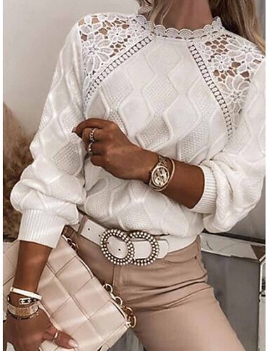 בגדי ריקוד נשים סוודר סקסי יום יומי רך צבע אחיד מצולע צווארון עגול קצר תחרה סרוג שרוול ארוך חולצות רגילות לִסְרוֹג בָּחוּץ יומי סוף שבוע לבן סתיו חורף
