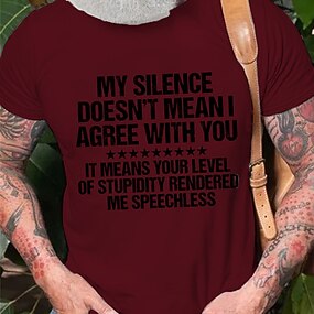 חולצת T-שירט גרפית מצחיקה עם ציטוט סרקסטי לגברים "השקט שלי לא אומר שאני מסכים טיפשותך השאירה אותי חסר מילים"