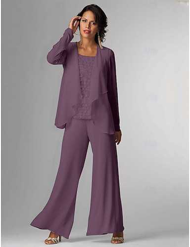 חליפת חתונה בחוף ים 3 חלקים אמא של הכלה אורחת חתונה אלגנטית בגודל פלאס צוואר מרובע באורך רצפה שיפון תחרה ללא שרוול עם קישוטים