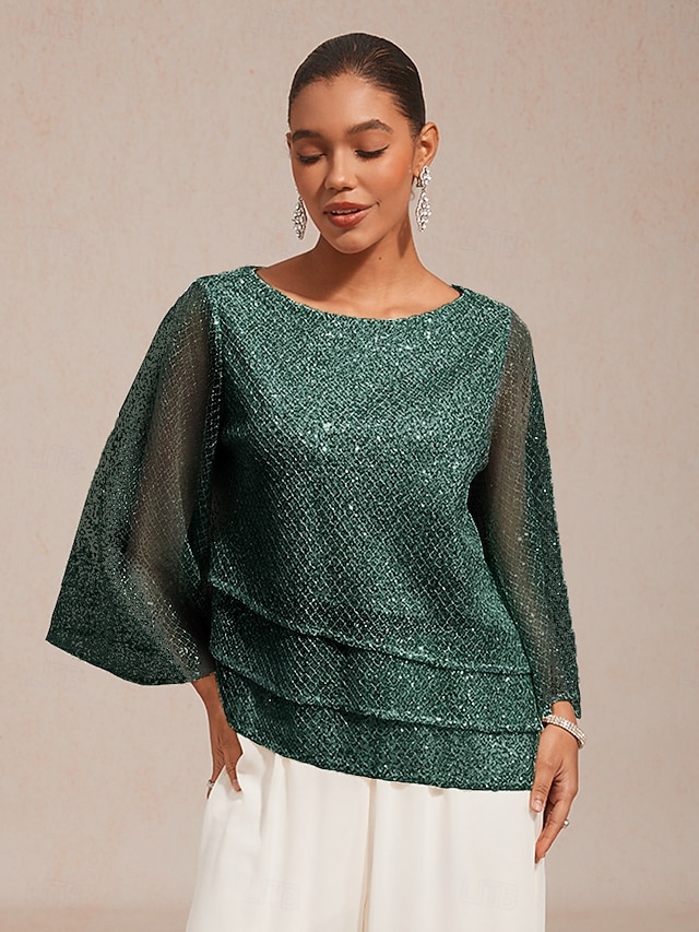 בגדי ריקוד נשים חולצות תחרה פאייטים אשליה צבע אחיד אלגנטית מסוגנן שרוול 4\3 פעמון צווארון עגול קצר חולצות ארוכות יומי אורחת חתונה בגדי נופש ירוק האנטר קיץ אביב סתיו #13768169