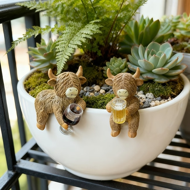 פסלוני שרף של פרה היילנד עם כוסות שתייה, תוספות חמודות לעציצים, פסל צפרדע משרף, מושלם לקישוט עציצים, גינות, אקווריומים וטרסות#14370628
