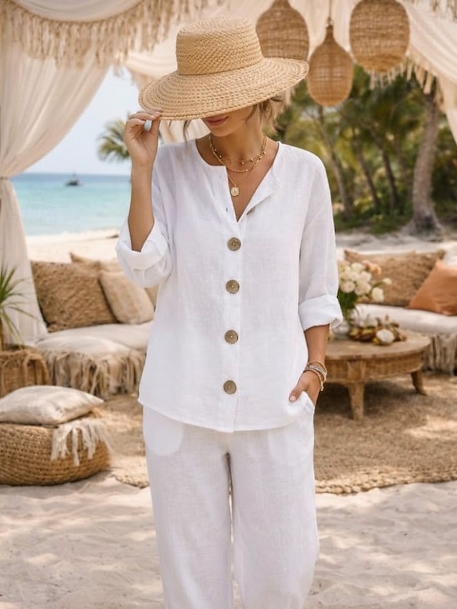 בגדי ריקוד נשים חולצה חולצות פשתן מכותנה כפתור למעלה 100% כותנה כפתורים צבע אחיד בסיסי יום יומי שרוול 4\3 צווארון V חולצות רגילות יומי שחור לבן אודם חאקי קיץ #15724065