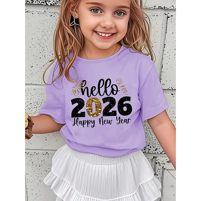 חולצת טריקו לבנות למסיבת ראש השנה 2026 עם גרפיקה תלת מימדית, אותיות, שרוולים קצרים, הדפס תלת מימד, קיץ, אביב, ספורט, אופנתי, אופנת רחוב, ילדים 4-12 שנים, צווארון עגול, חוץ, קז'ואל, יומי, גזרה רגילה #15765515