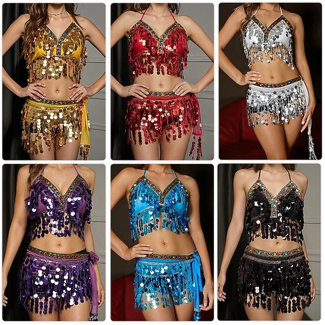 בגדי מחול סמסה - סט חצאית עם תליוני פייטים ורצועה מתכווננת לנשים עיצוב נוצץ לריקוד בטן 2 חלקים| תלבושת מופע