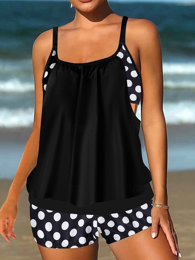 בגד ים טנקיני 2 חלקים לנשים עם חצאיות מחטב בטן מותן גבוהה שקוף בגד ים חופים עם פסים נקודתיים וצווארון U ללא שרוולים #18206685