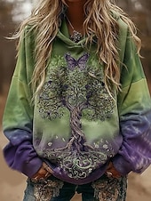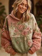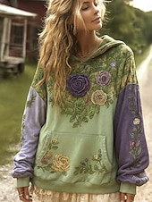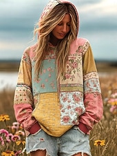 מעיל הודי וינטאג' בוהו לנשים מדפסת תלת ממד פאטצ'וורק מעיל סוודר פרחוני סוודר פולאובר סוודר אוברסייז חם ספורטיבי קפוצ'ון יומיומי פאטצ'וורק שחור לבן צהוב ורוד כהה אביב סתיו חורף