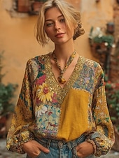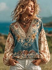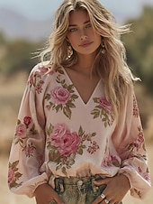 חולצת בוהו לנשים מבד כמו איטום קליל ונושם עם גרפיקה פרחונית אלגנטית בוהמית וינטג' עם שרוול ארוך וצווארון V טופס קבוע יום יומי חופש פיסול כפתורים הדפס כחול לבן ורוד תכלת קיץ
